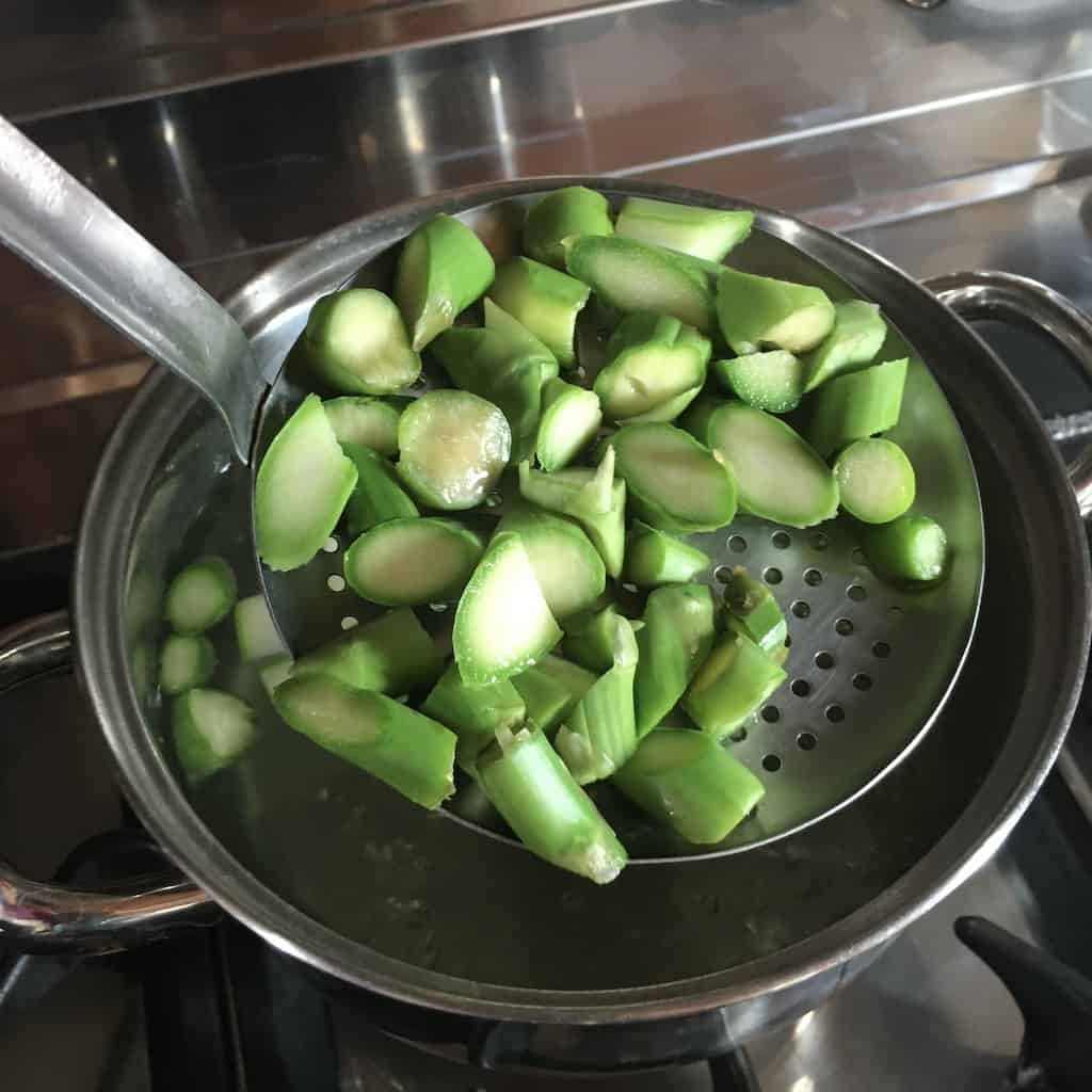 - Wash and trim the asparagus, keeping only the tender parts. Discard any tough or woody ends. Bring a medium pot of lightly salted water to a boil. Add the asparagus and blanch until bright green, then strain.