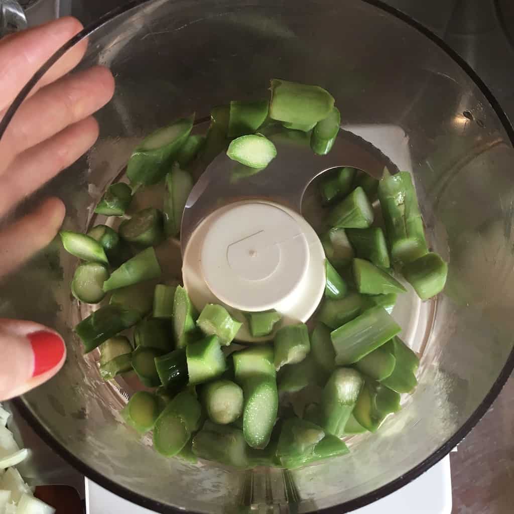 - Transfer the asparagus to a blender or food processor with ½ cup (or a little more) of the milk, and blend until smooth.