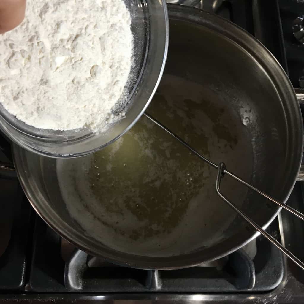 - Make the roux. In a separate medium pot, melt the butter over medium heat. Add the flour a little at a time, whisking constantly to prevent lumps. Keep whisking for 5-7 minutes until the flour is cooked and the roux turns lightly golden brown. Reduce the heat to low.