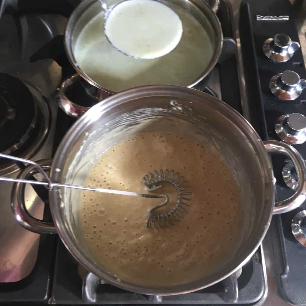 5. In a separate medium pot, melt the butter over medium heat. Add the flour a little at a time, whisking constantly to prevent lumps. Keep whisking for 5-7 minutes until the flour is cooked and the roux turns lightly golden brown. Reduce the heat to low.