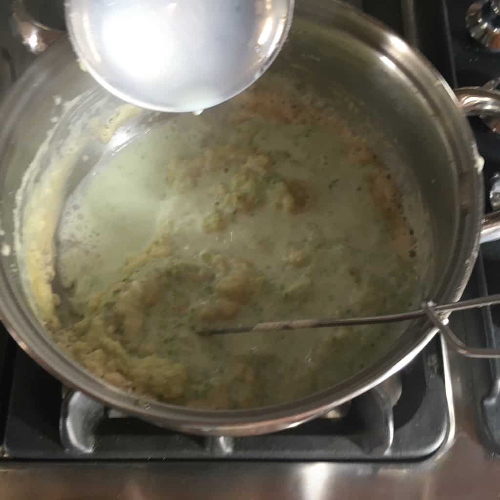 - Combine the milk mixture with the roux. Add one ladle of the warm asparagus-milk mixture and whisk vigorously. Continue adding the mixture one ladle at a time, whisking well after each addition.
