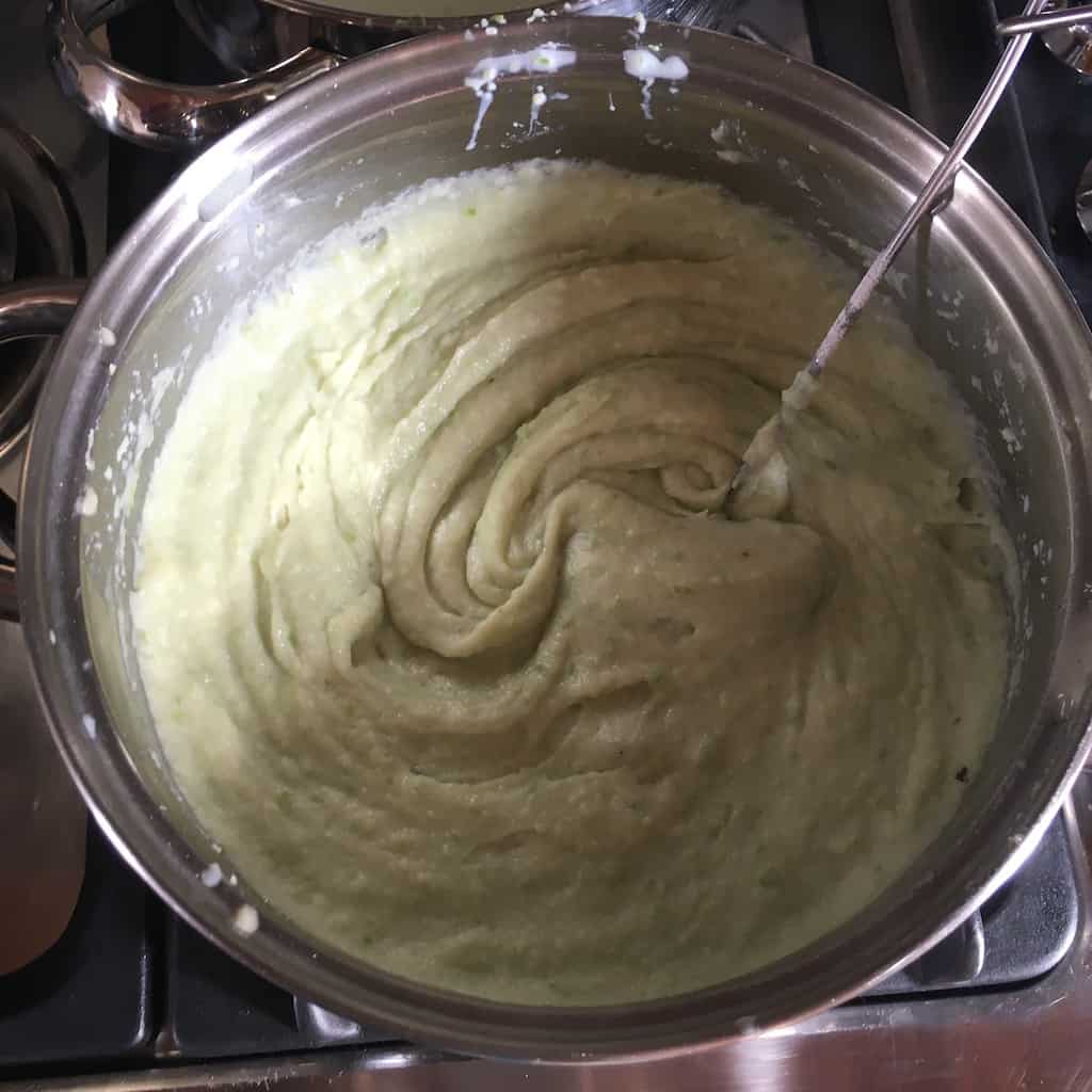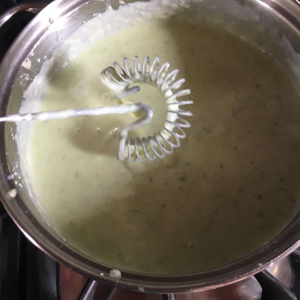 4. Warm the asparagus-milk mixture over medium heat until hot but not boiling. Turn off the heat, set aside, and keep warm while you make the roux.