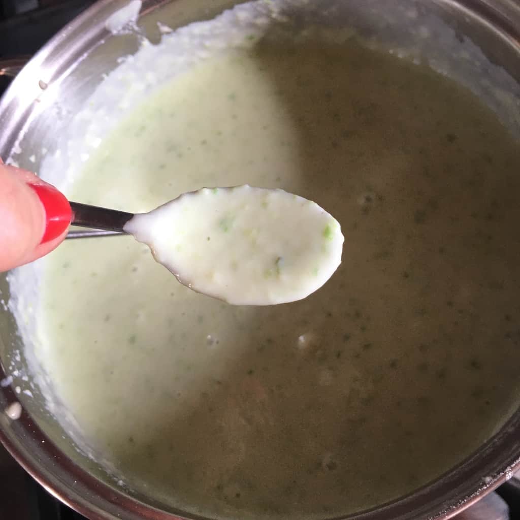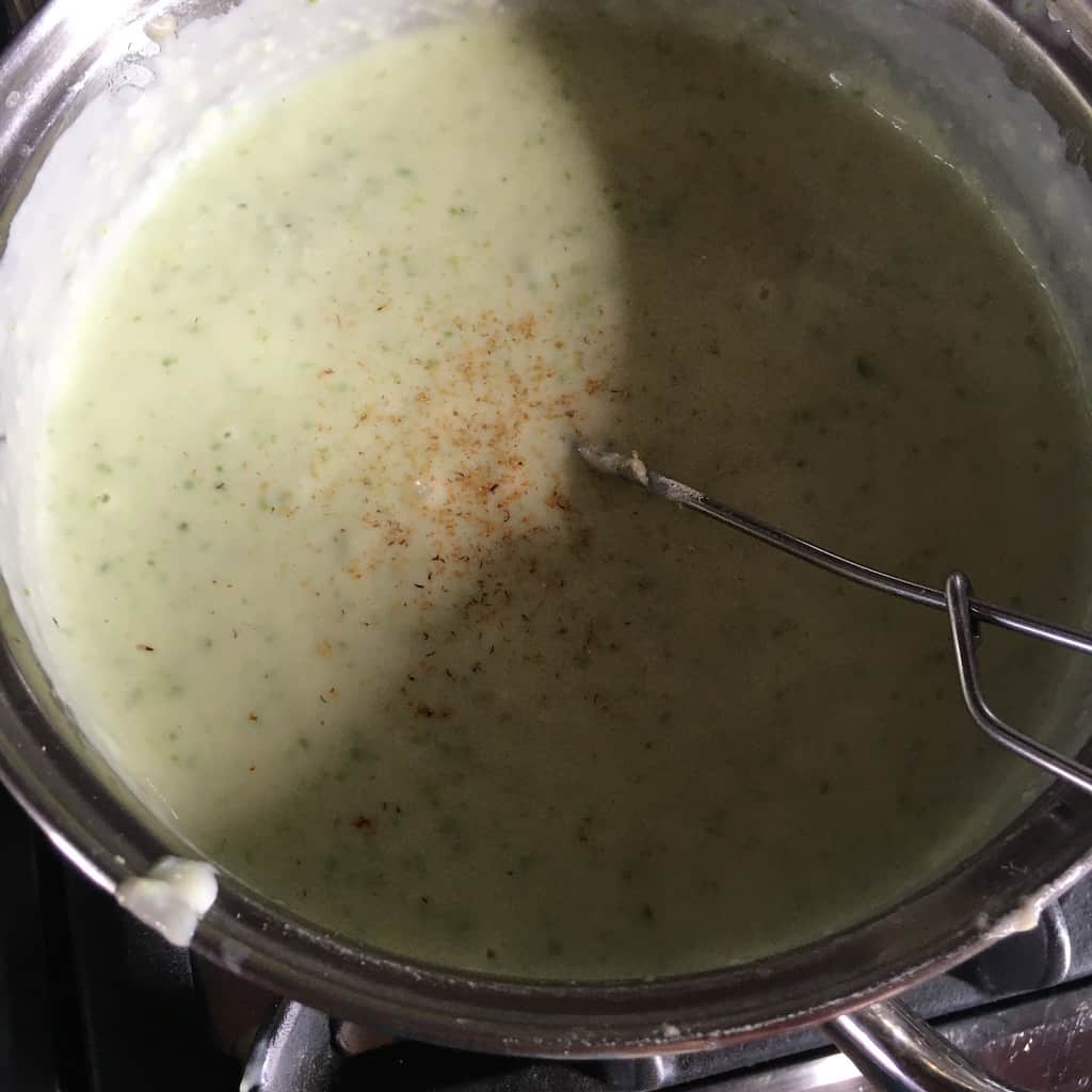 6. Add one ladle of the warm asparagus-milk mixture and whisk vigorously. Continue adding the mixture one ladle at a time, whisking well after each addition. Once all the milk is incorporated, keep cooking and whisking until the sauce thickens and falls in ribbons from the spoon. Taste and adjust salt and nutmeg as needed.