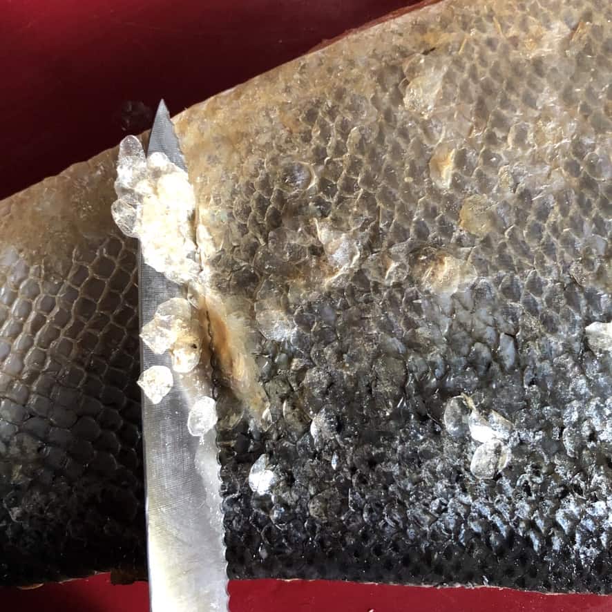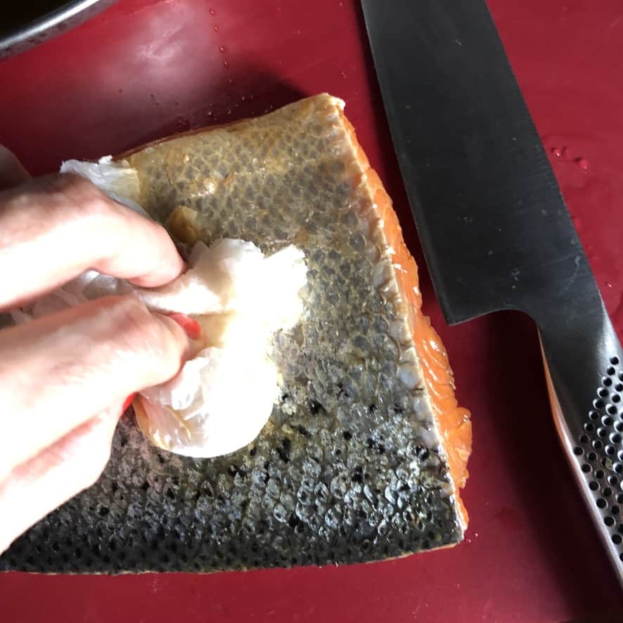 - Pat the salmon dry + remove the scales from the skin (optional step). Pat the salmon completely dry. Remove the scales using a small serrated paring knife (or another sharp knife or fish scaler), and scrape off the scales by running the knife in the opposite direction of the scales. They should easily flake off. Wipe the salmon once more to remove any flaked-off loose scales and to ensure it's completely dry before proceeding.