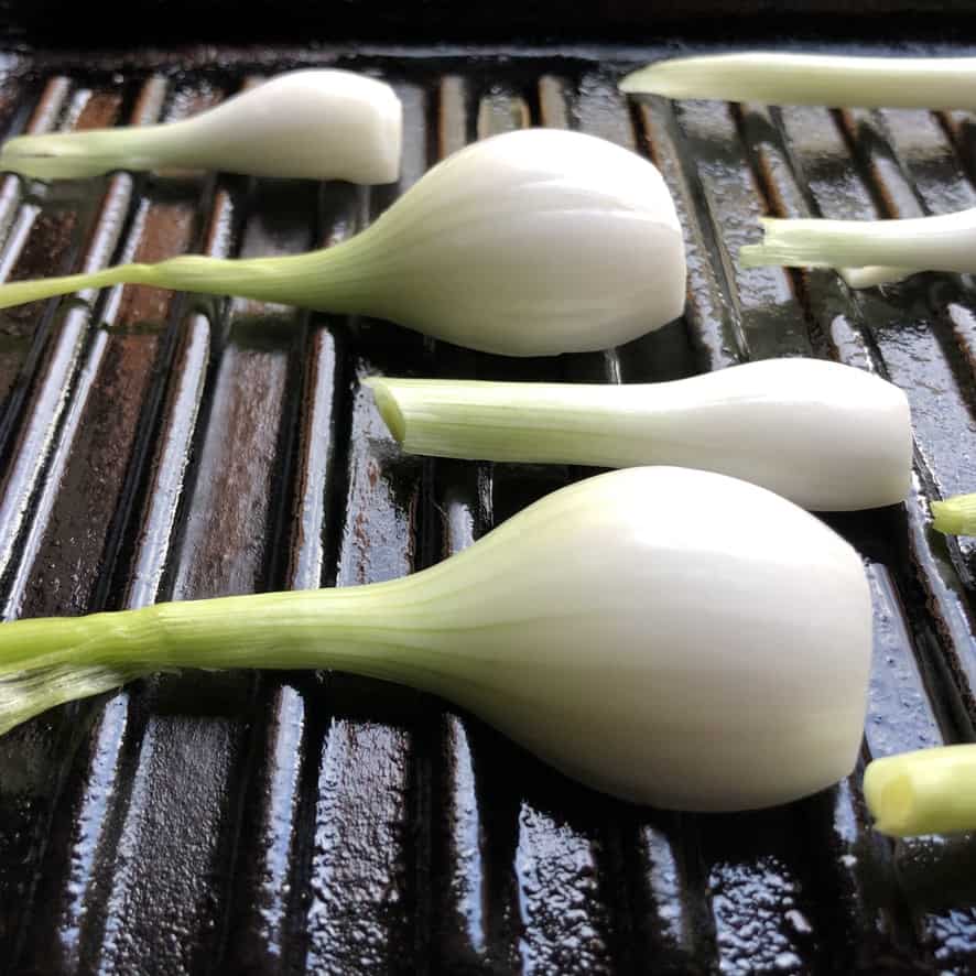 - Grill the scallions. Remove the green parts from the scallions and dice to use as garnish. Slice the white part of the scallions in half, rub them with a small amount of olive oil, season with salt and grill them on a medium-high preheated grill pan or in a cast-iron skillet for about 6 minutes total or until golden brown and soft, flipping them over occasionally to ensure even cooking.