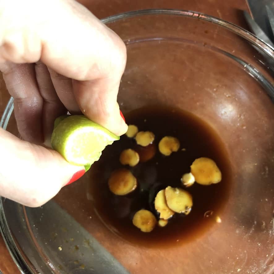 - Marinate the salmon. Wash and pat dry the side of salmon (or salmon filets) until completely dry and add it to a shallow dish. Add the soy sauce, Shaoxing wine, superior light soy sauce, ponzu sauce, miso, and sesame oil to a small bowl, whisk, taste, and squeeze a little fresh lime juice, adjust seasoning adding more lime juice as desired. Pour the marinade on top of the salmon evenly coating both sides. Turn the meat flesh side (orange side) down, cover, and marinate in the refrigerator for 20 minutes.