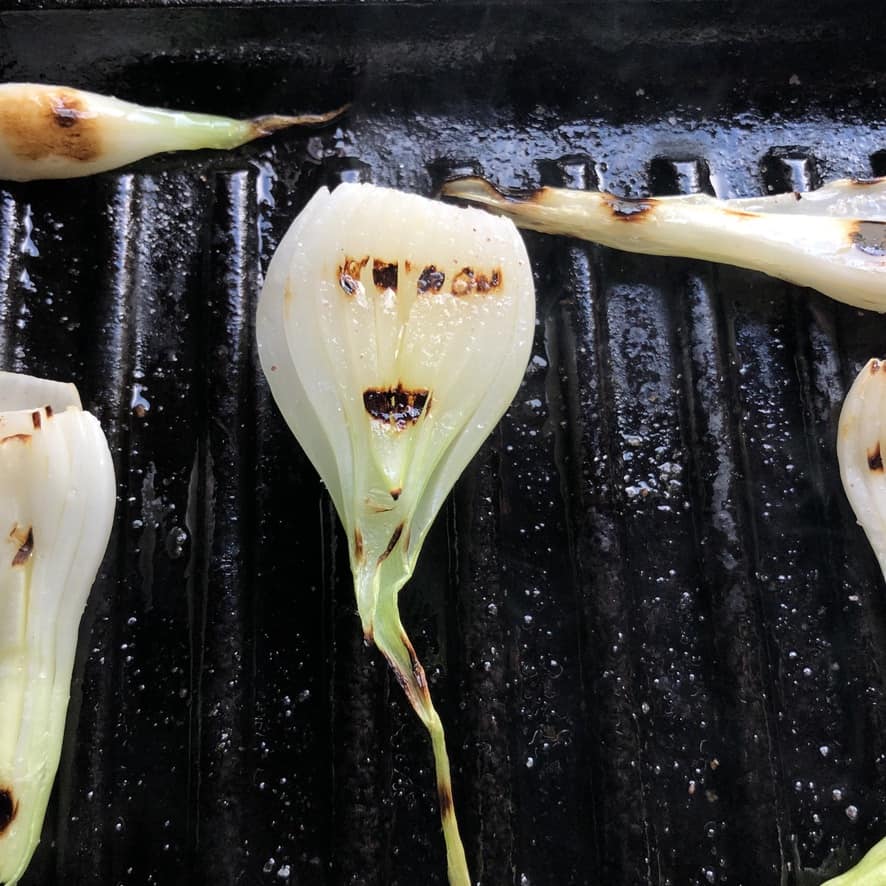 - Grill the scallions. Remove the green parts from the scallions and dice to use as garnish. Slice the white part of the scallions in half, rub them with a small amount of olive oil, season with salt, and grill them on a medium-high preheated grill pan or in a cast-iron skillet for about 6 minutes total or until golden brown and soft, flipping them over occasionally to ensure even cooking.
