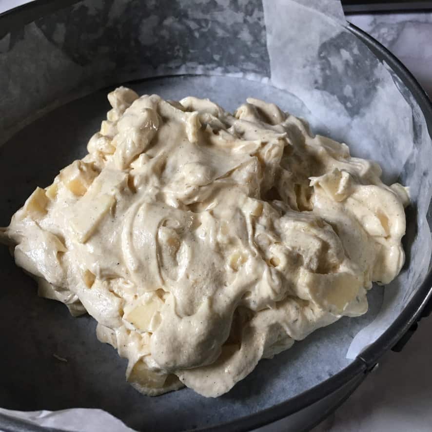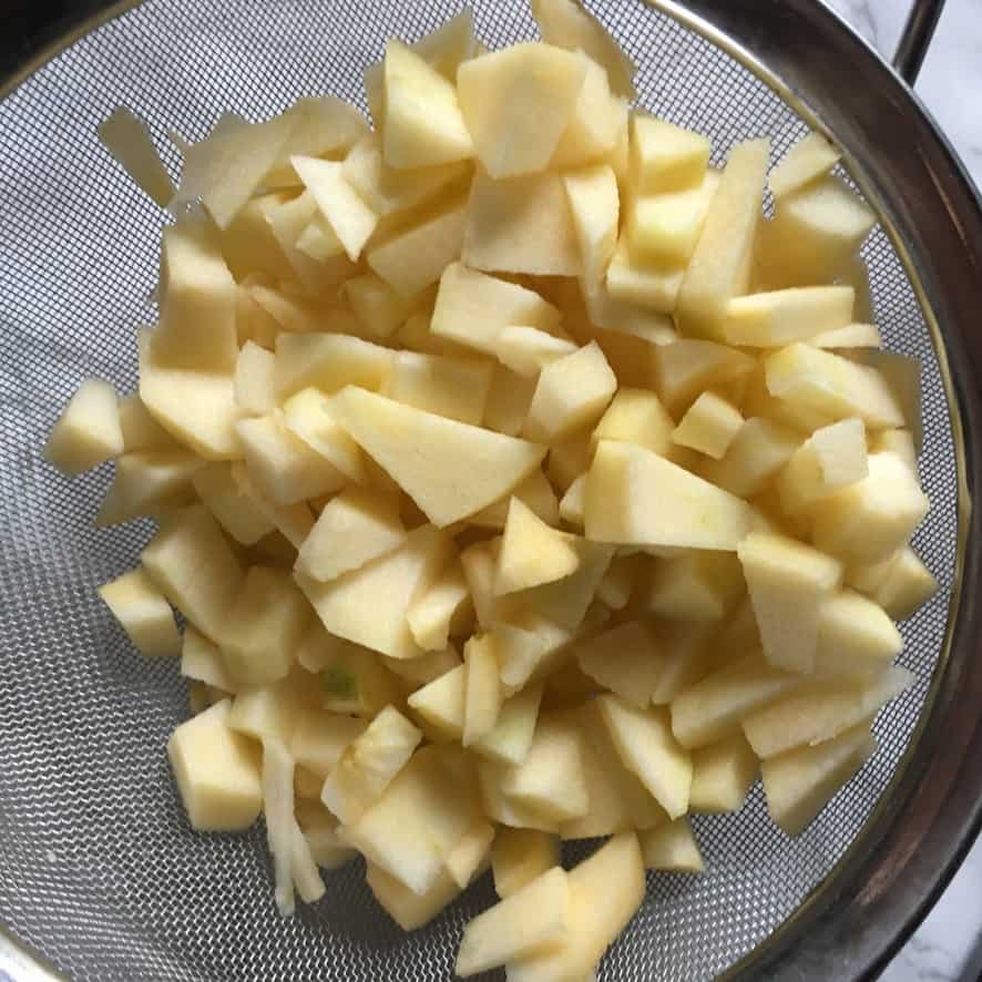 - Prepare the apples. Peel and dice the apples and place them into a bowl of water with a few squeezes of lemon juice and leave for about 5 minutes. Strain the apples, dry them on a clean tea towel, and set them aside while you finish mixing the cake batter. *see notes