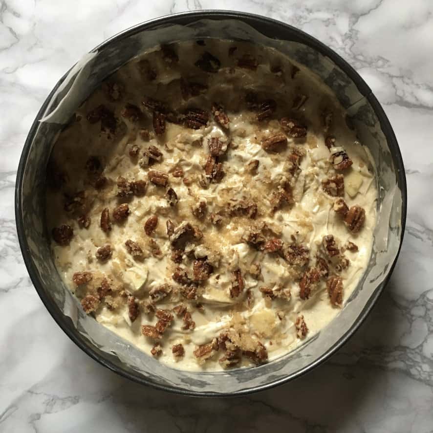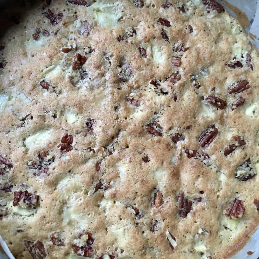 - Decorate the top + bake. Sprinkle the Pecan Crunch evenly over the top of the cake batter and bake for 30-40 minutes, or until golden brown and a cake tester comes out clean. Remove the cake to a wire rack and allow it to cool to room temperature. Once cooled, remove the ring and the parchment paper from the sides of the springform pan. Carefully invert the cake, remove the parchment paper and place it right side up on a serving platter. Serve warm or at room temperature by itself or with a dollop of whipped cream or scoop of vanilla bean ice cream and Enjoy!