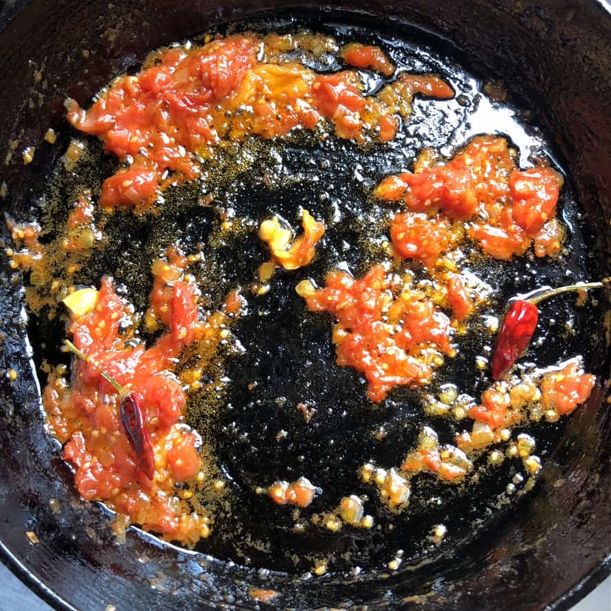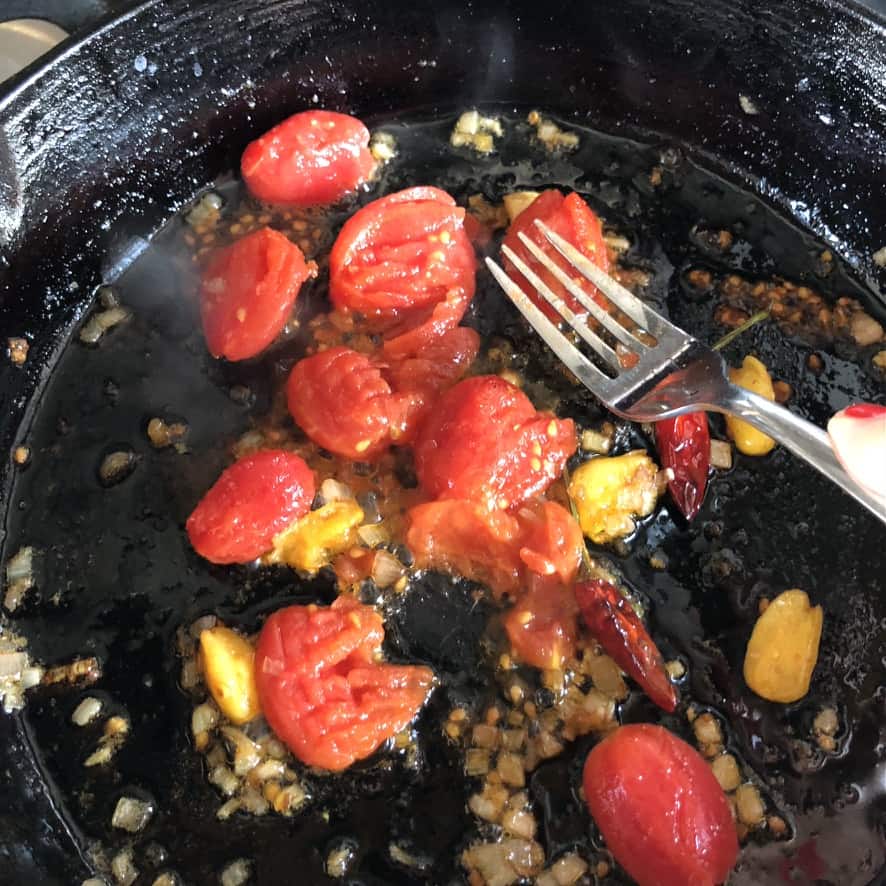 - Add the tomatoes. Add the tomatoes, season with salt, smash them down using a fork to break them up, and cook for about 5 minutes.
