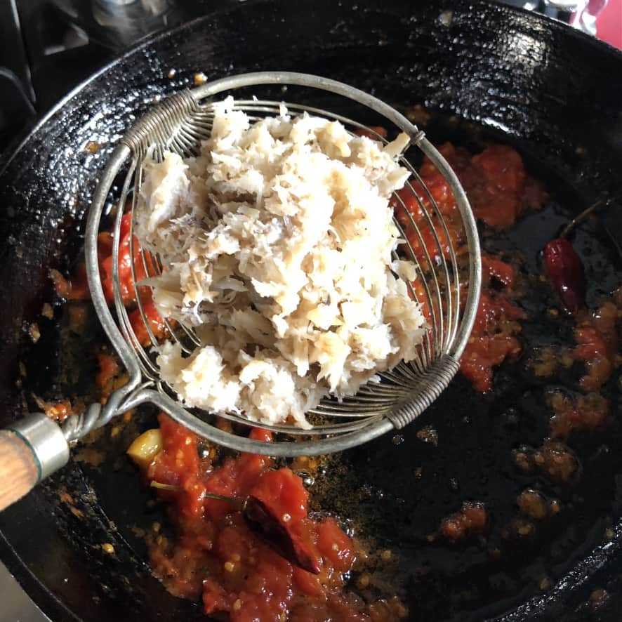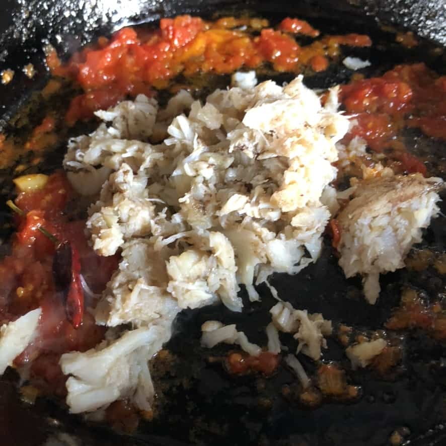 - Finish the crab sauce. While the pasta is boiling, add the crab meat, season with salt if needed, and stir the sauce to combine. *If you haven't timed the pasta to be ready just as the sauce is ready, turn off the heat to the sauce while you wait for the pasta to finish cooking which will keep it from getting too dry.