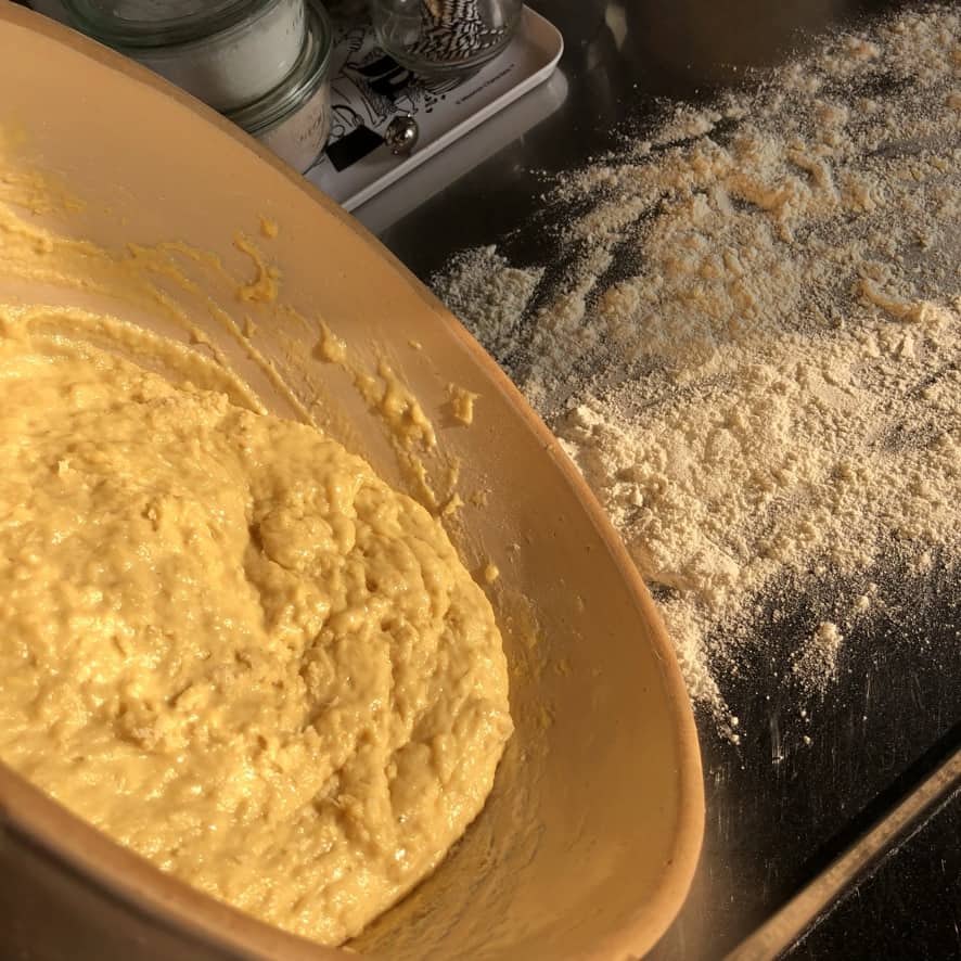 Pour the mixture (which will have a sludge-like consistency at this point) onto a lightly floured countertop. Add the extra flour you set aside only as needed until the dough no longer sticks to your hands. *See photos for reference