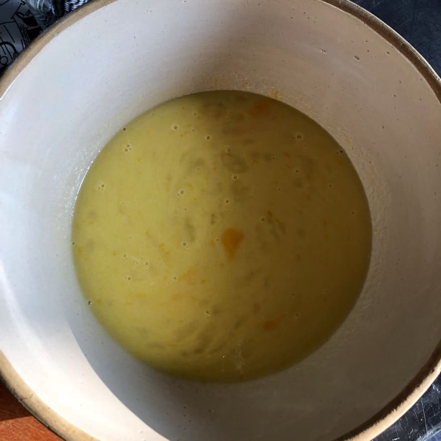 Step 2. Warm up the milk & combine the wet ingredients. Warm the milk, then add butter, sugar, salt, and eggs, and whisk until just combined. *The milk should be just warm, not hot, or it will kill the yeast when added to the flour mixture.